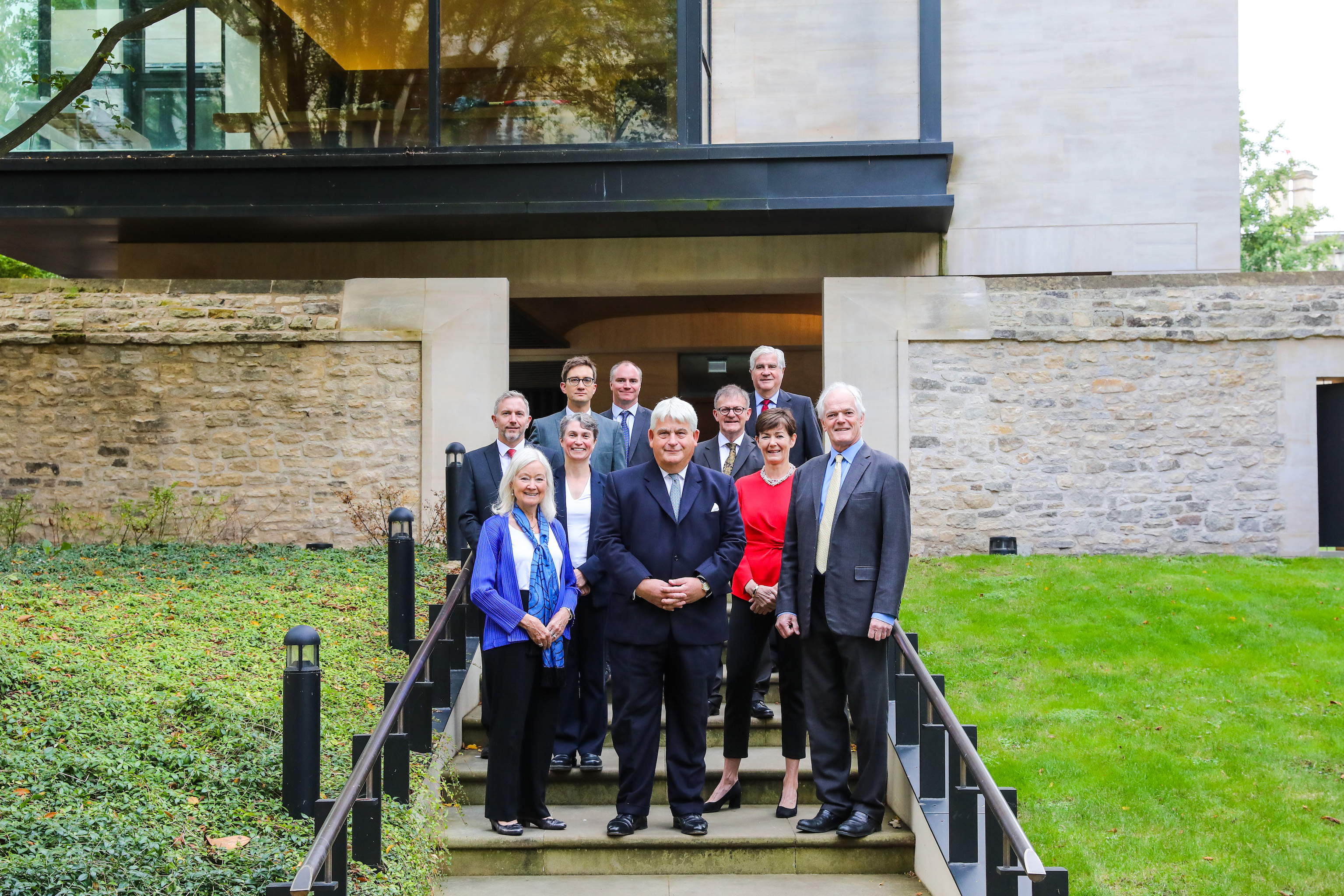 Image: Thomas White Oxford's expanded board outside St John's College's New Library and Study Centre. Front row L-R Professor Dame Kay Davies, Bernard Taylor, William Donger, middle row L-R Professor Jason Schnell and Zoe Hancock, back L-R Mark Taylor, Professor Andrew Parker and Professor Jan Obloj.